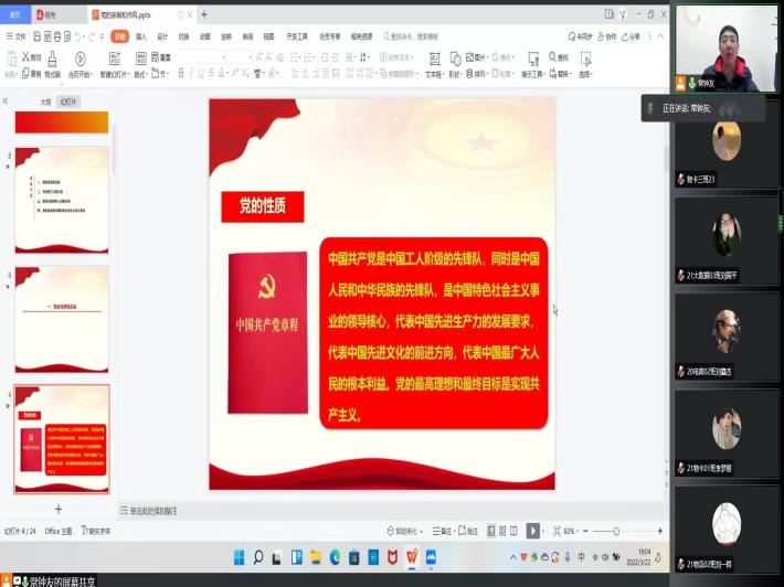 为确保在疫情防控下入党积极分子党课培训工作正常进行,提高学员们的思想素养和政治素质,激励同学们付出实际行动向党组织靠拢,3月22日晚,beat365中文官方网站通过腾讯会议平台举办线上入党积极分子培训班第一讲。本次党课学习培训活动由我院党委书记贾江讲授,2022年第一期入党积极分子参加。