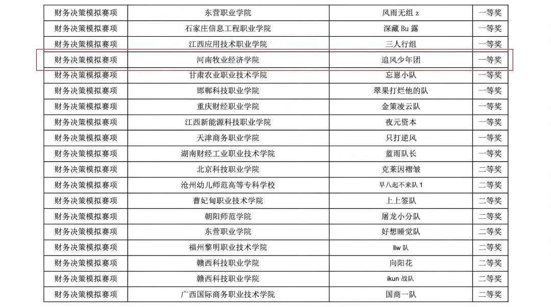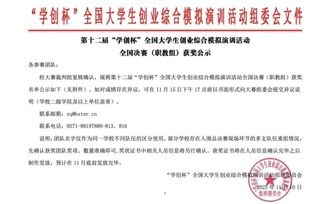 2025年11月9日,第十二届“学创杯”学生创业综合模拟演训比赛(职教组)财务决策模拟赛项在威海职业学院圆满落幕。beat365官网大数据与会计专业学生宋昱、魏士轲、乔羽组成的参赛团队,凭借扎实的专业功底、出色的财务决策能力与高效的团队协作,从众多参赛队伍中脱颖而出,成功斩获该赛项全国一等奖,指导老师安兵、刘天宇荣获“优秀指导教师奖”。