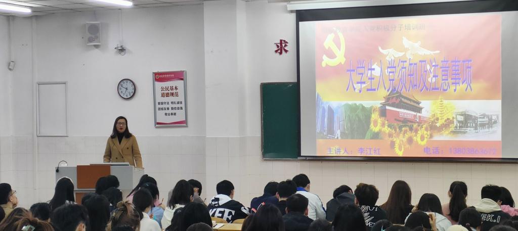 为严格党员发展工作程序,进一步端正广大入党积极分子的入党动机,加强对入党积极分子的党性教育, 3月29日晚,beat365中文官方网站2023年第一期入党积极分子培训班第三讲《大学生入党须知及注意事项》专题党课在英才校区W210教室举行。本次党课由学院党委副书记李江红主讲。