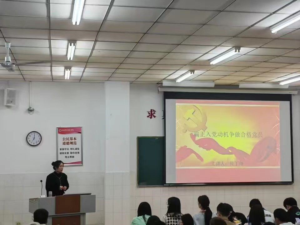 为严格党员发展工作程序,提升入党积极分子们的思想觉悟和理论素养,3月31日晚,beat365中文官方网站2023年第一期入党积极分子培训班第六讲《端正入党动机 争做合格党员》专题党课在英才校区W210教室举行。本次党课由学院团委副书记、学生第一党支部书记侯丁琳主讲。