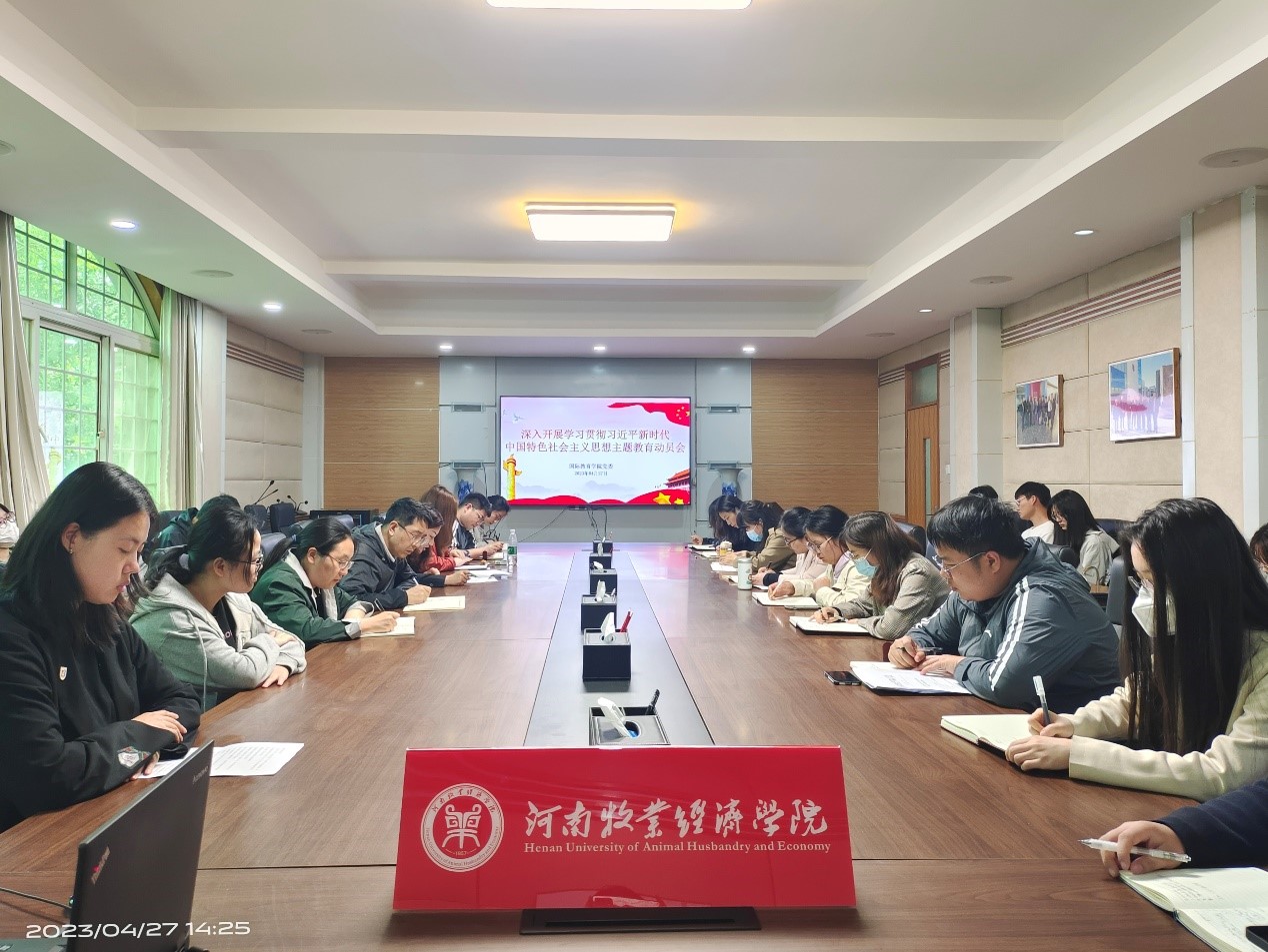 4月27日下午,beat365中文官方网站在教学办公楼113会议室召开深入开展学习贯彻习近平新时代中国特色社会主义思想主题教育动员会。院党委书记贾江主持会议并作动员讲话。全体教工党员、部分学生党员代表参加会议。