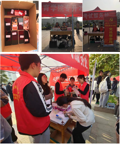 专升本考试当天,学院领导和毕业班辅导员坚守在考试服务处,以便第一时间为学生提供热心细致的服务,千方百计为学生营造良好考试环境。因考试要求,除身份证和准考证外的物品不能带入候考区,为保证同学们的物品安全,老师们提前准备好纸箱收纳学生手机,贴好标签,老师蹲坐在石阶上看守,等待同学们顺利考试结束。学院为专升本学子准备了矿泉水、湿巾、口罩、士力架和紧需药品等物资,这些暖心行为使考生倍感温暖。