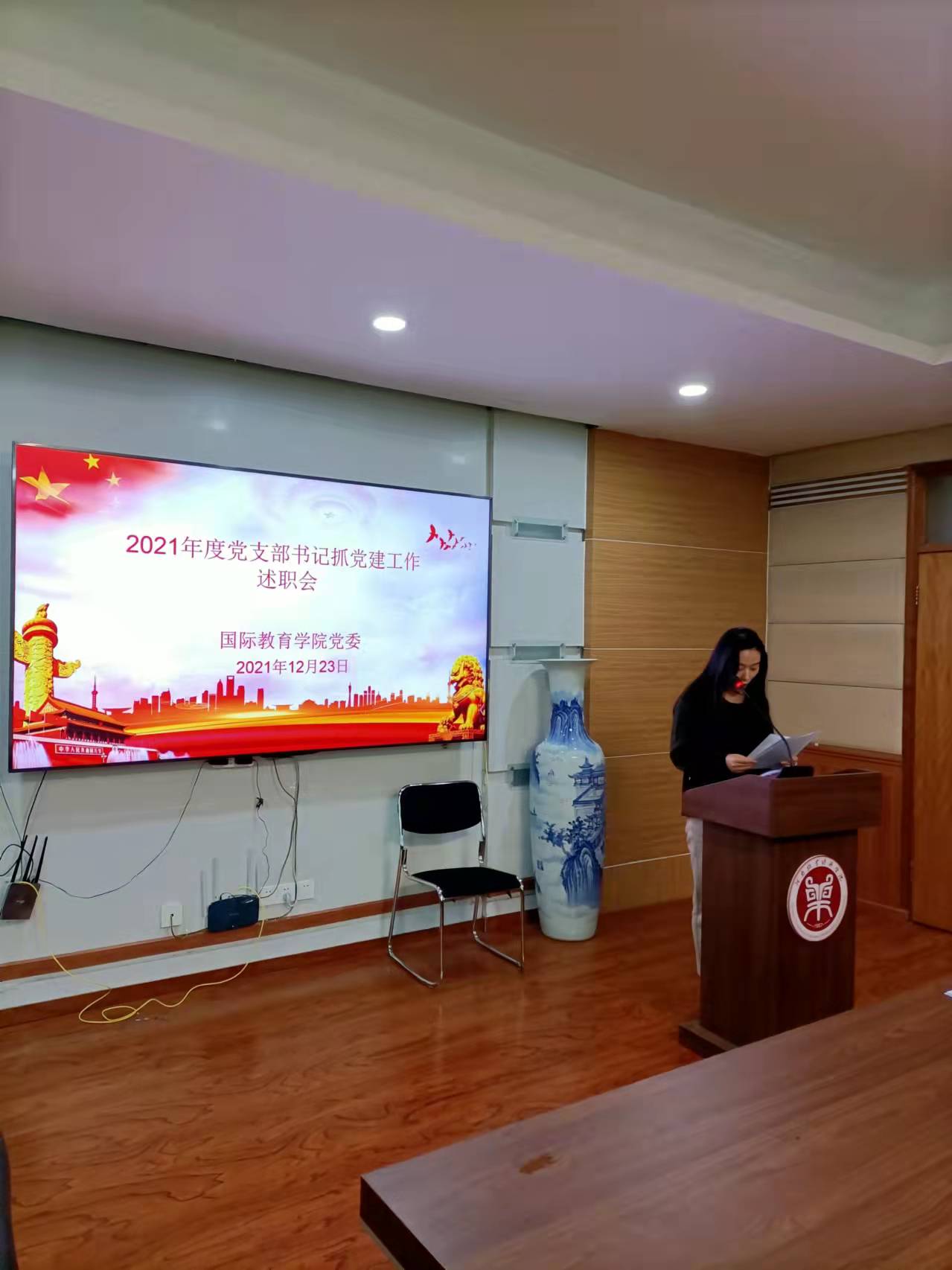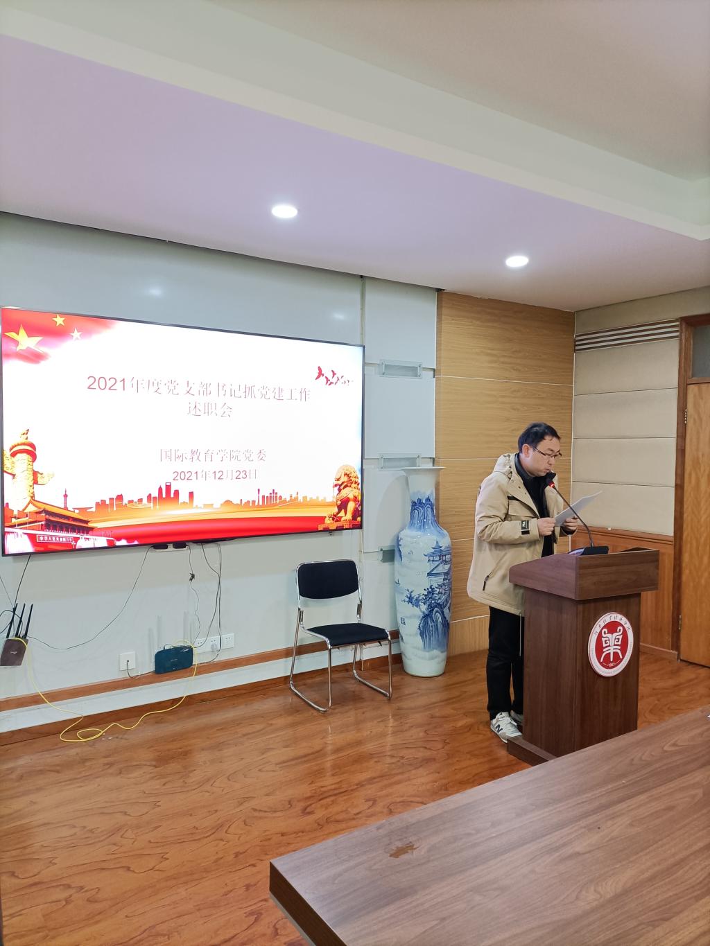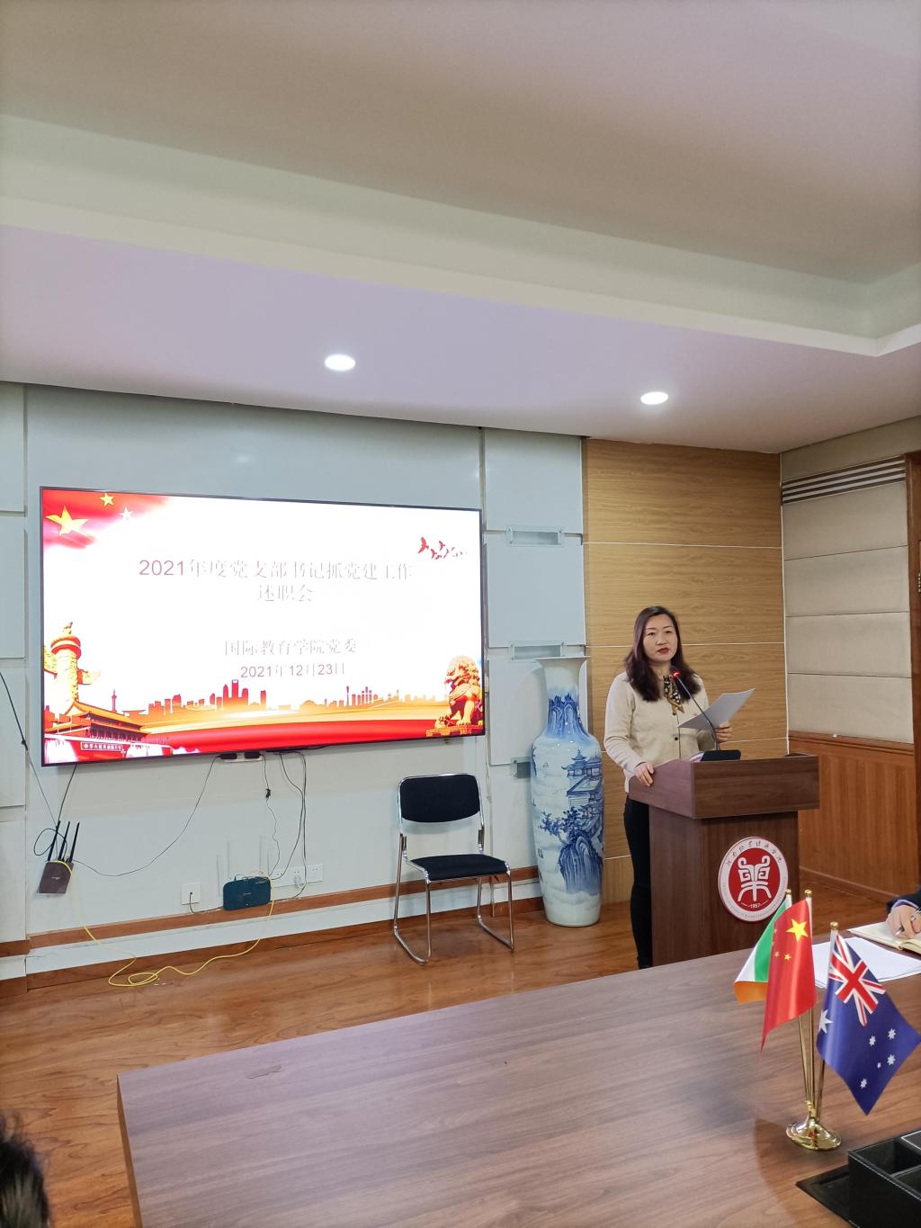 12月23日上午,beat365中文官方网站在教学办公楼113会议室召开2021年度党支部书记抓党建工作述职评议会。学院全体教工党员、部分学生党员代表参加会议。会议由院党委书记贾江主持。